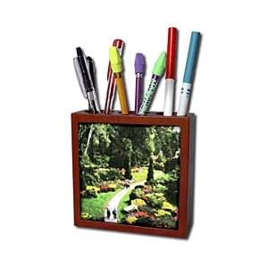 Product Description : Red Yellow Green European Garden Tile Pen Holder is great on a desk or counter top. Made of high quality solid wood with a satin finish. Image displayed on one inset high gloss 4.25" x 4.25" ceramic tile. Overall size is 5" x 5" x 1 2/3" with 3- 1 1/3" top holes.