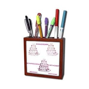 Product Description : Scrapbooking Hobby Tile Pen Holder is great on a desk or counter top. Made of high quality solid wood with a satin finish. Image displayed on one inset high gloss 4.25" x 4.25" ceramic tile. Overall size is 5" x 5" x 1 2/3" with 3- 1 1/3" top holes.